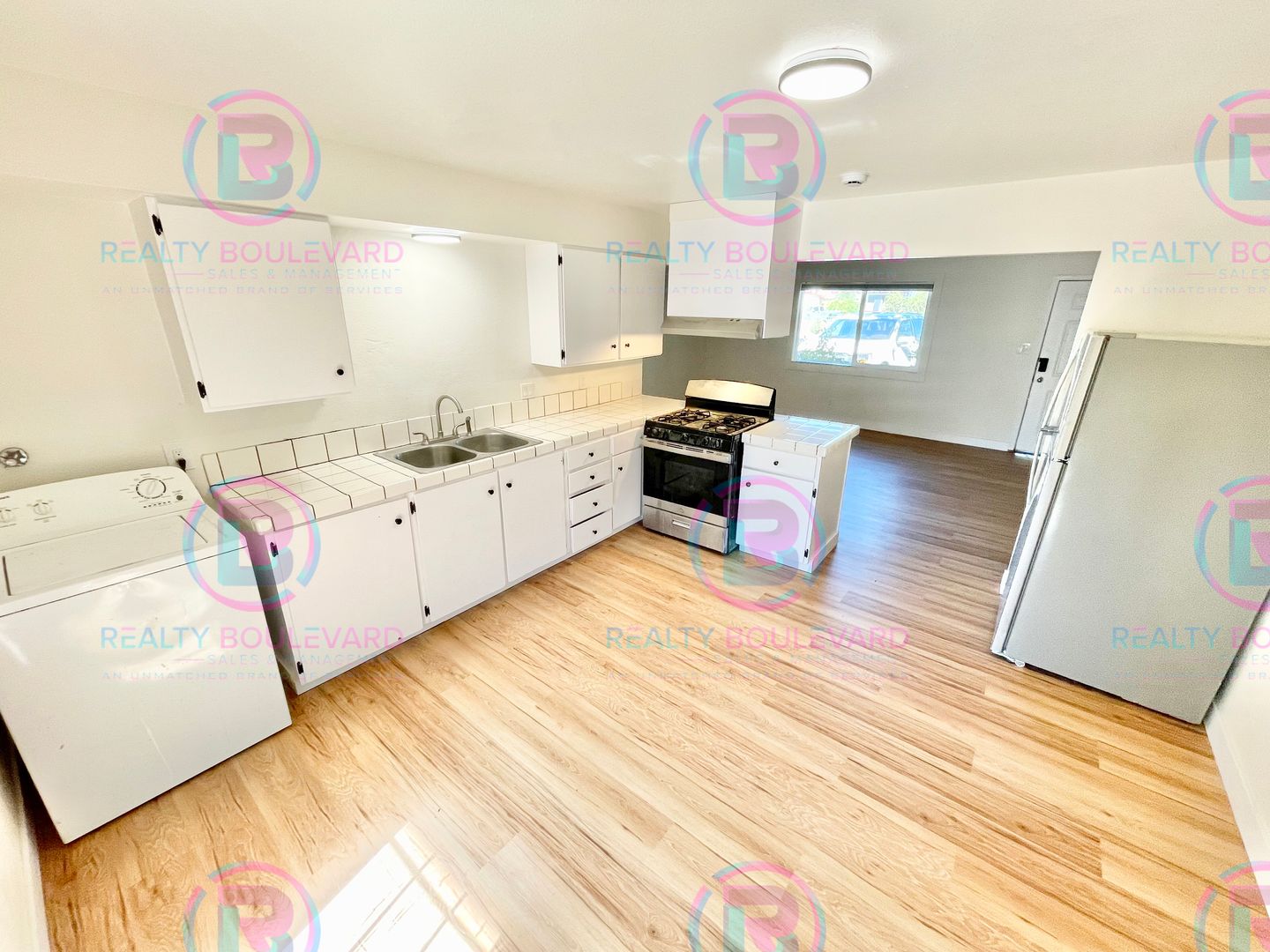 The kitchen is thoughtfully designed with tile countertops and comes fully equipped with a stove, microwave, and refrigerator — everything you need to cook and entertain with ease. A washer and dryer are also included for your convenience, making laundry days simple and stress-free.